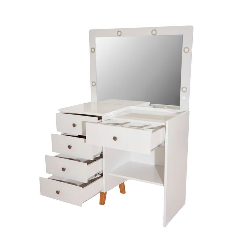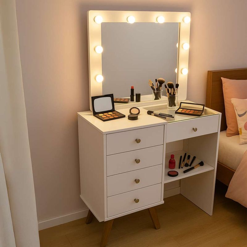 El tocador Camarim en color Off White combina elegancia y funcionalidad para tu rutina diaria. Con amplio espejo, superficie para organizar cosméticos y compartimientos prácticos, es ideal para mantener todo en orden. Su diseño moderno y acabado neutro se adapta a cualquier dormitorio o vestidor.